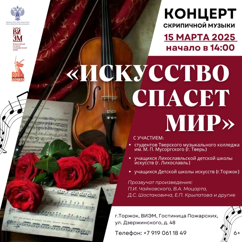 К 80-летию Великой Победы и Году защитника Отечества в Торжке в Гостинице Пожарских состоится праздничный концерт «Искусство спасёт мир» с участием талантливых студентов Тверского музыкального колледжа им. М. П. Мусоргского, учащихся Лихославльской детской школы искусств и Детской школы искусств г. Торжка.