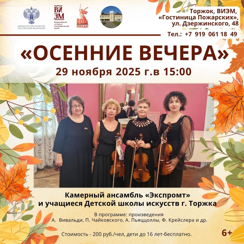 В уютных стенах Гостиницы Пожарских пройдет концерт классической музыки «Осенние вечера». Произведения Вивальди, Чайковского, Пьяццоллы, Крейслера и др. в исполнении камерного ансамбля «Экспромт» и юных талантов Детской школы искусств г. Торжка наполнит ваше сердце гармонией и согреет теплом настоящего искусства.