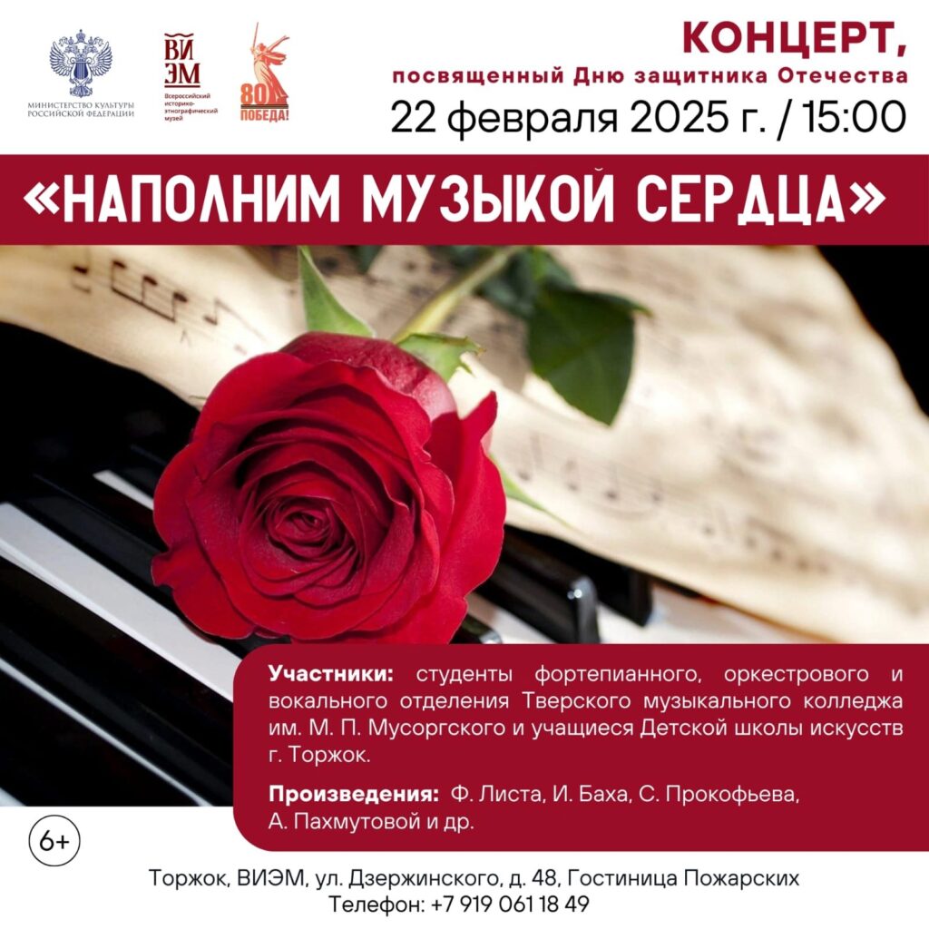 «Наполним музыкой сердца» — концерт фортепианной музыки, посвященный Дню защитника Отечества. Исполнители, давно завоевавшие любовь новоторов и гостей города, — учащиеся Детской школы искусств г. Торжка и студенты Тверского музыкального колледжа им. М. П. Мусоргского.