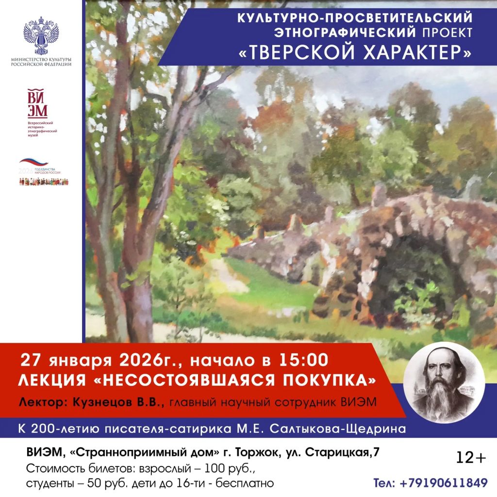 К Дню рождения великого русского писателя-сатирика М. Е. Салтыкова-Щедрина (1826-1889) 27 января 2026 года в 15:00 в Странноприимном доме пройдет тематическая лекция «Несостоявшаяся покупка».