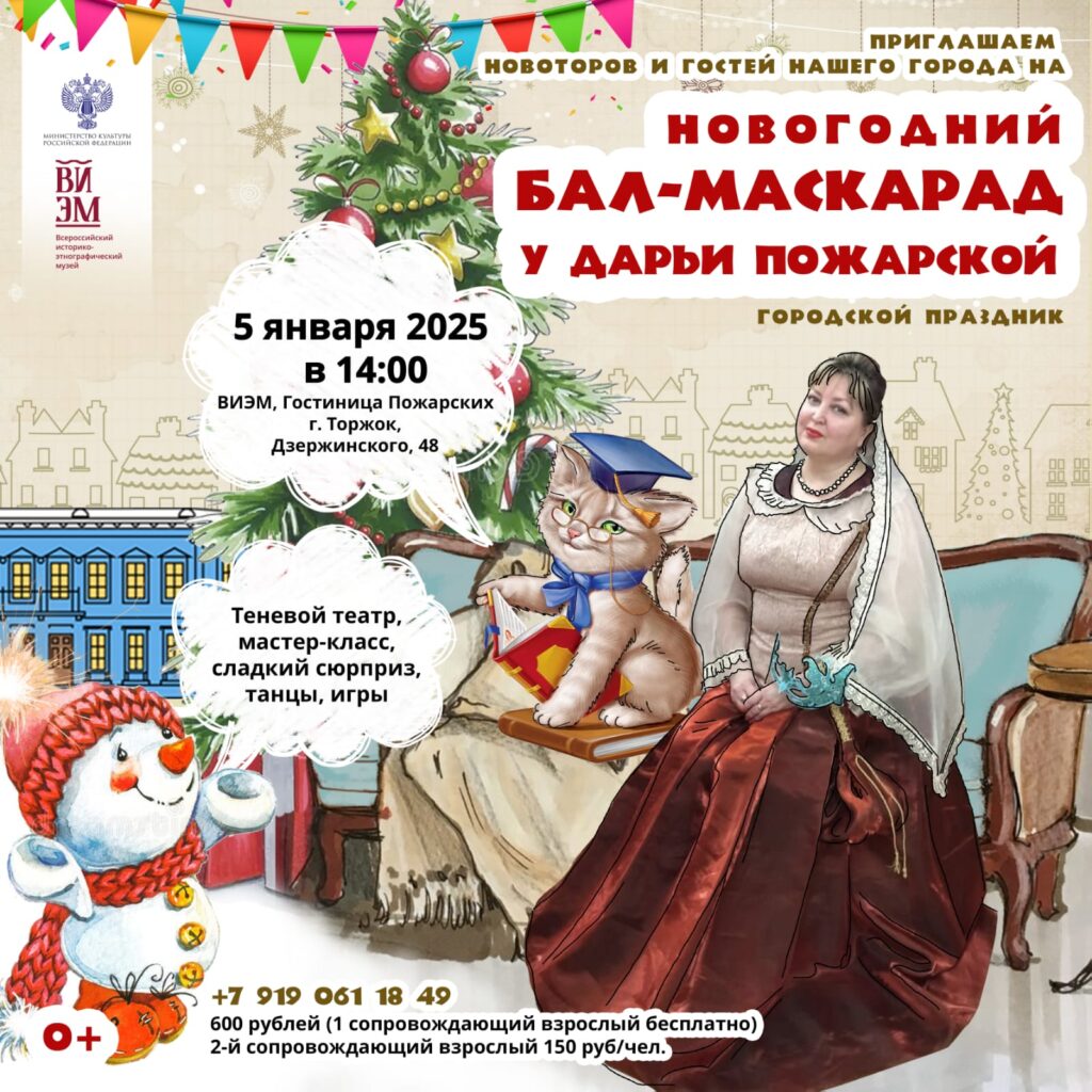 Самая известная новоторжская купчиха Дарья Пожарская приглашает новоторов и гостей города на Новогодний бал-маскарад в Гостинице Пожарских. Вместе со сказочными героями участники бала узнают об исторических танцах, бальном этикете и истории Нового года. Торжественная атмосфера, веселое общение и невероятная музыка, ожидание чуда – все это, безусловно, подарит невероятное ощущение праздника!