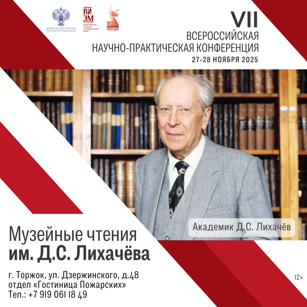 Приглашаем вас принять участие в работе VII Всероссийской научно-практической конференции «Музейные чтения им. Д. С. Лихачёва», которая пройдёт 27–28 ноября 2025 года во Всероссийском историко-этнографическом музее (ВИЭМ, Торжок, Тверская область). Конференция приурочена к 119-летию со дня рождения академика Д. С. Лихачёва.