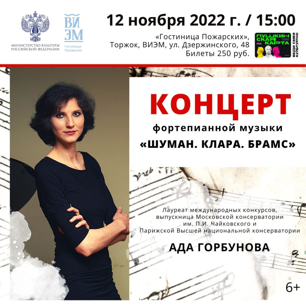 12 ноября в Гостинице Пожарских лауреат международных конкурсов, выпускница Московской консерватории им. П. И. Чайковского и Парижской высшей национальной консерватории Ада Горбунова представит новую концертную программу.
