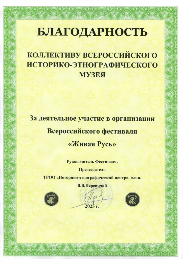 Благодарность коллективу ВИЭМ за деятельное участие в организации фестиваля «Живая Русь»