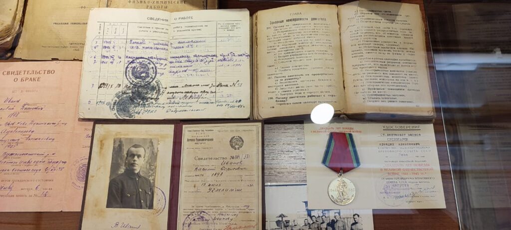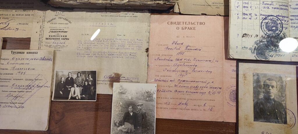 Впрочем, семью, сохранившую столько различных реликвий, что их хватило на три музейных зала, вряд ли можно назвать обычной. В основе экспозиции — предметы быта, документы, фотографии из семейного архива, книги (начиная с журнала для семейного чтения за 1905 год), которые хранились в доме. И каждый из них — «мостик» от мира частной жизни к истории эпохи. Старинная тетрадь по географии (ещё в твёрдом, картонном переплёте) становится поводом поговорить о советском образовании, удостоверение о регистрации деревянного дома — об истории застройки города. Наградной лист — о Великой Отечественной войне.
