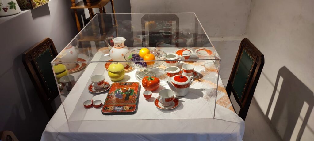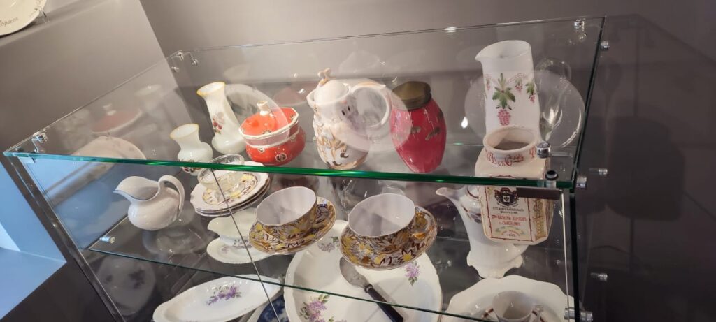Внимание посетителей привлекла и коллекция фарфора. Здесь представлены редкие образцы кузнецовского фарфора и фаянса, изготовленные на легендарном заводе в Конаково. Многие из этих предметов искусства жители и гости Торжка уже могли видеть в залах Всероссийского историко-этнографического музея. Татьяна Магаревич принимала участие в совместных проектах ВИЭМ и Российской ассоциации международного сотрудничества, входила в число кураторов выставок, организованных ВИЭМ в рамках взаимодействия с Индонезией и Шри-Ланкой, редкости из ее коллекции демонстрировались в Гостинице Пожарских.