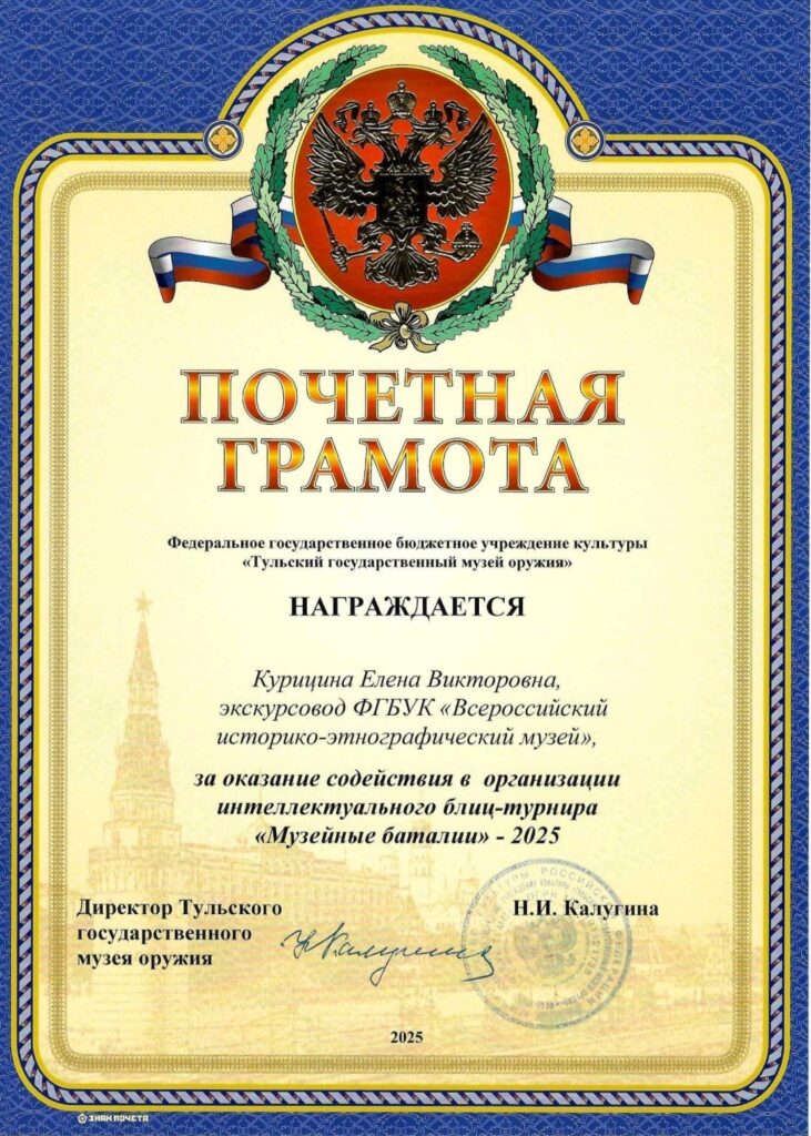 На днях наш экскурсовод — Елена Викторовна Курицина- получила почётную грамоту за активное участие и содействие в проведении турнира.