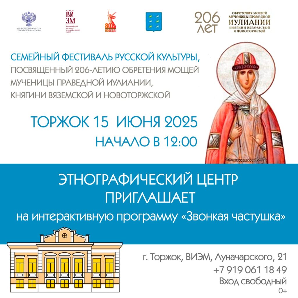 В рамках Фестиваля русской культуры, посвящённого 206-летию обретения мощей мученицы праведной Иулиании, княгини Вяземской и Новоторжской, «Сказочный дворик» Этнографического центра ВИЭМ приглашает семьи с детьми на интерактивную программу «Звонкая частушка».