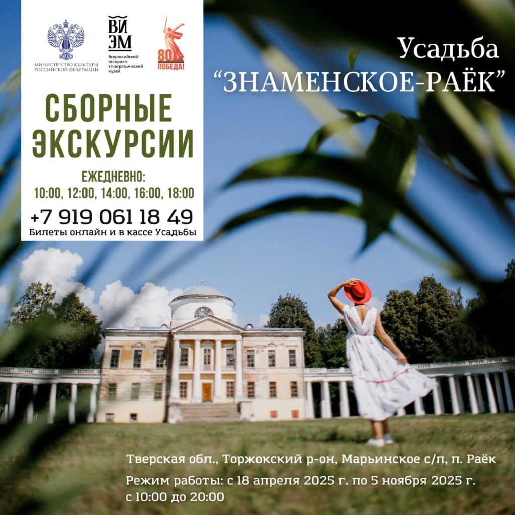 Уважаемые посетители! В период с 15 апреля 2025 года до 17 апреля 2025 года усадьба Знаменское-Раёк открыта для посещения ежедневно с 10:00 до 18:00. Вход на территорию усадьбы платный — 100 рублей. На период с 18 апреля 2025 года по 5 ноября 2025 года усадьба открыта для посещений ежедневно с 10:00 до 20:00.