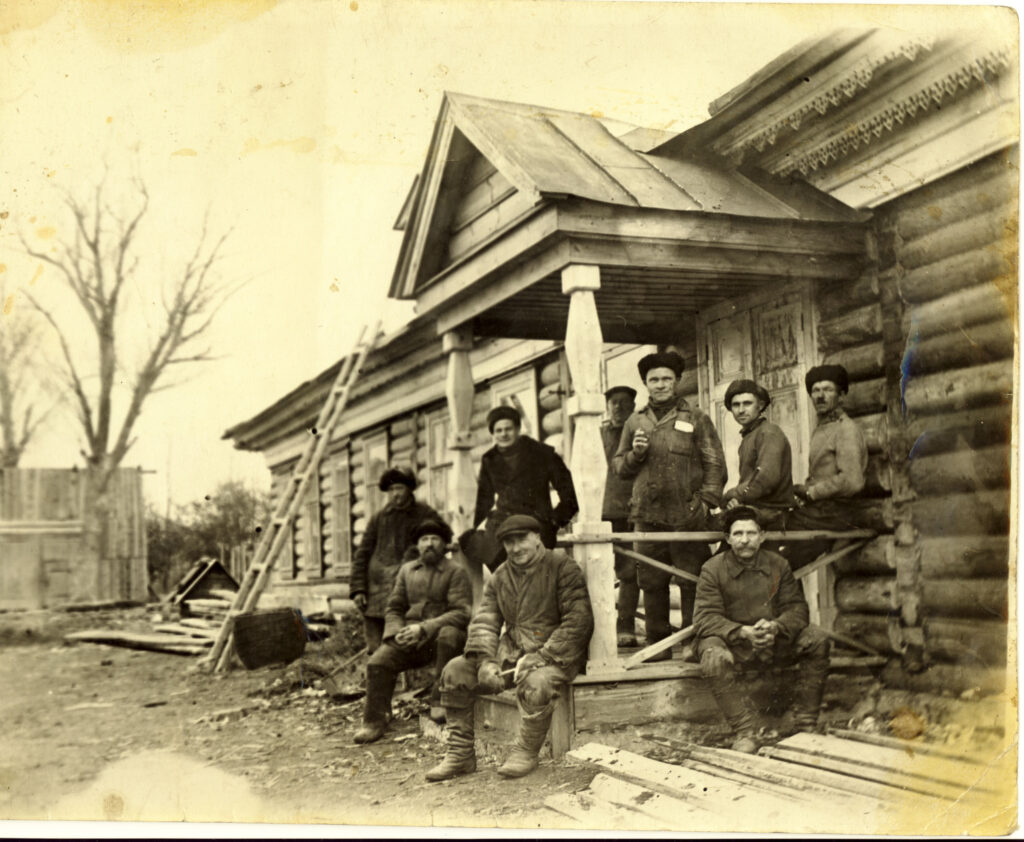 Фото. А. В. Соколов – директор школы слепых в Торжке среди строителей у здания производственных мастерских. Торжок, 1939 г. © ВИЭМ