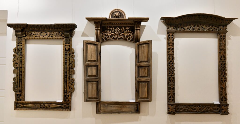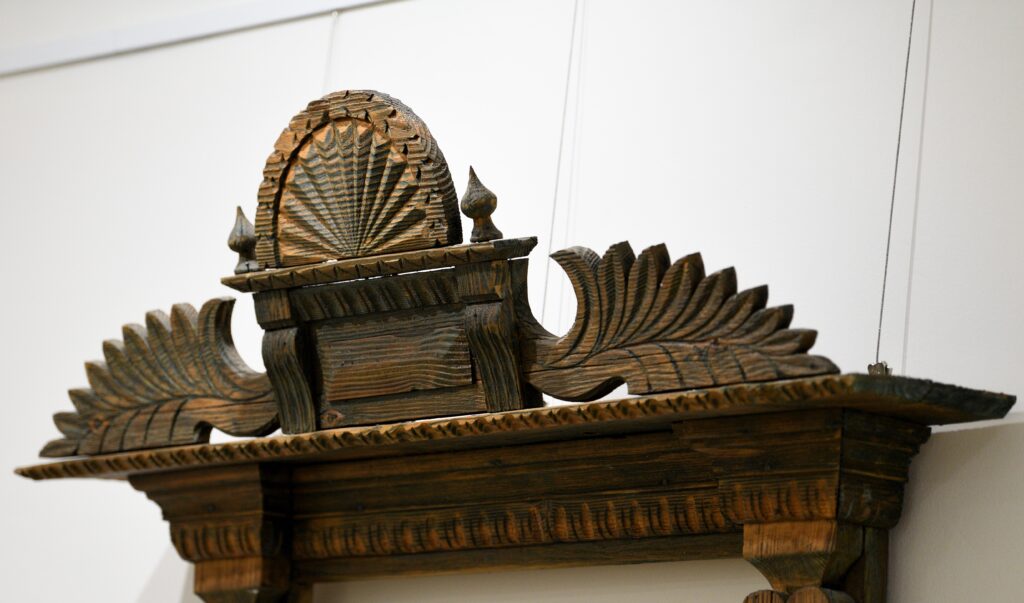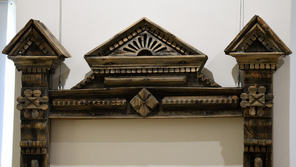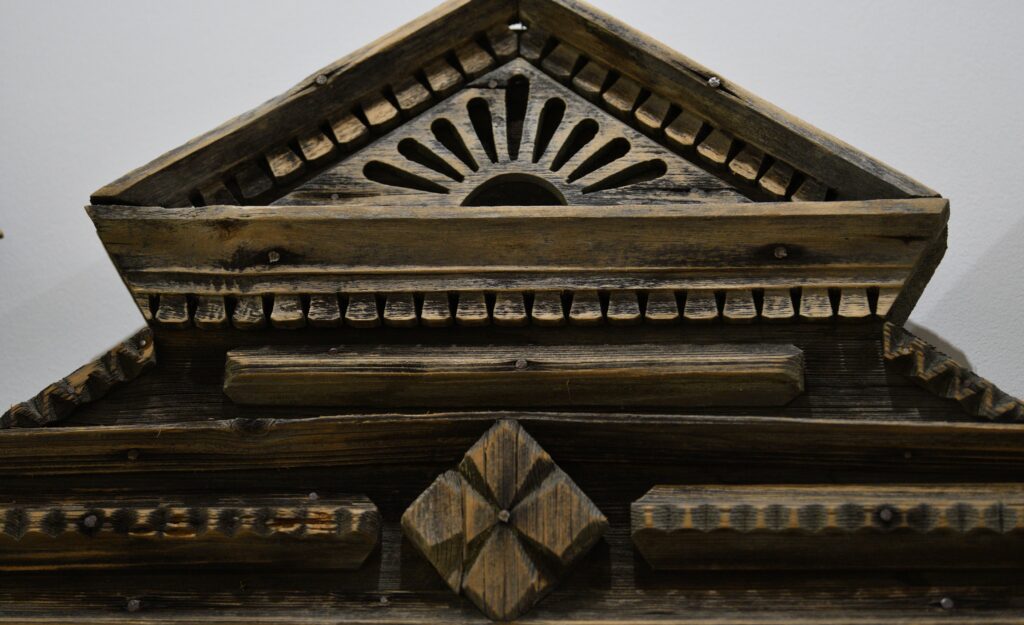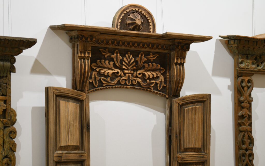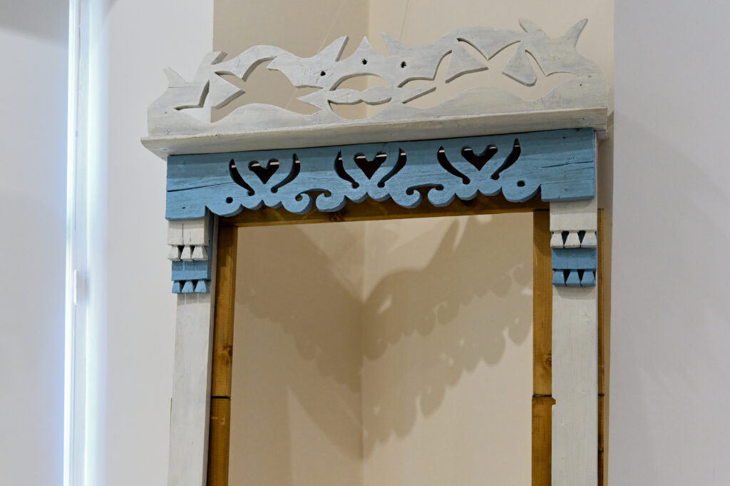 В экспозиции представлены наличники из коллекции НГИАМЗ и ВИЭМ, собранные в ходе этнографических экспедиций по заброшенным деревням.