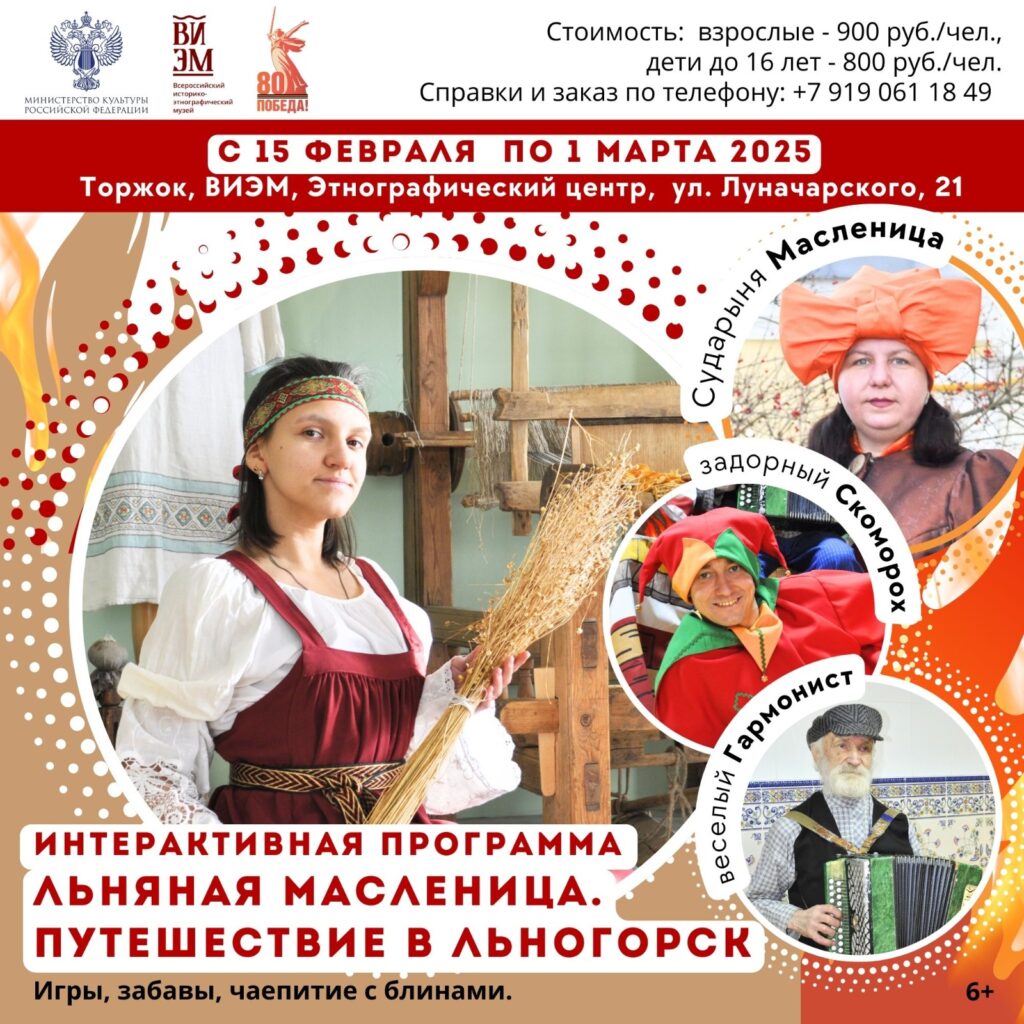 Всероссийский историко-этнографический музей приглашает окунуться в атмосферу настоящей русской Масленицы с неповторимым новоторжским колоритом! В сказочном дворике Этнографического центра гостей встретят Сударыня Масленица, Льняная Барыня, веселый гармонист и задорные скоморохи!