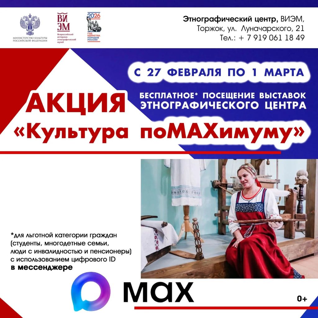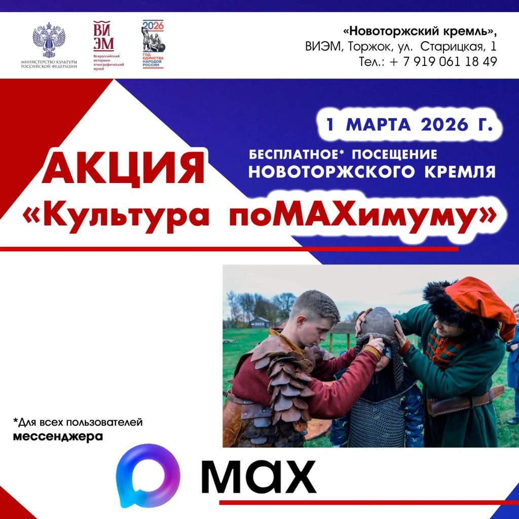 Люди с инвалидностью, студенты, члены многодетных семей, пенсионеры при использовании цифрового ID в национальном мессенджере МАХ смогут бесплатно посетить 1 марта Новоторжский кремль, а также с 27 февраля по 1 марта экспозиции Этнографического центра «Русь живая», «Не пьянства ради» и выставку «Путешествие в Льногорск».