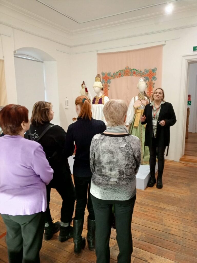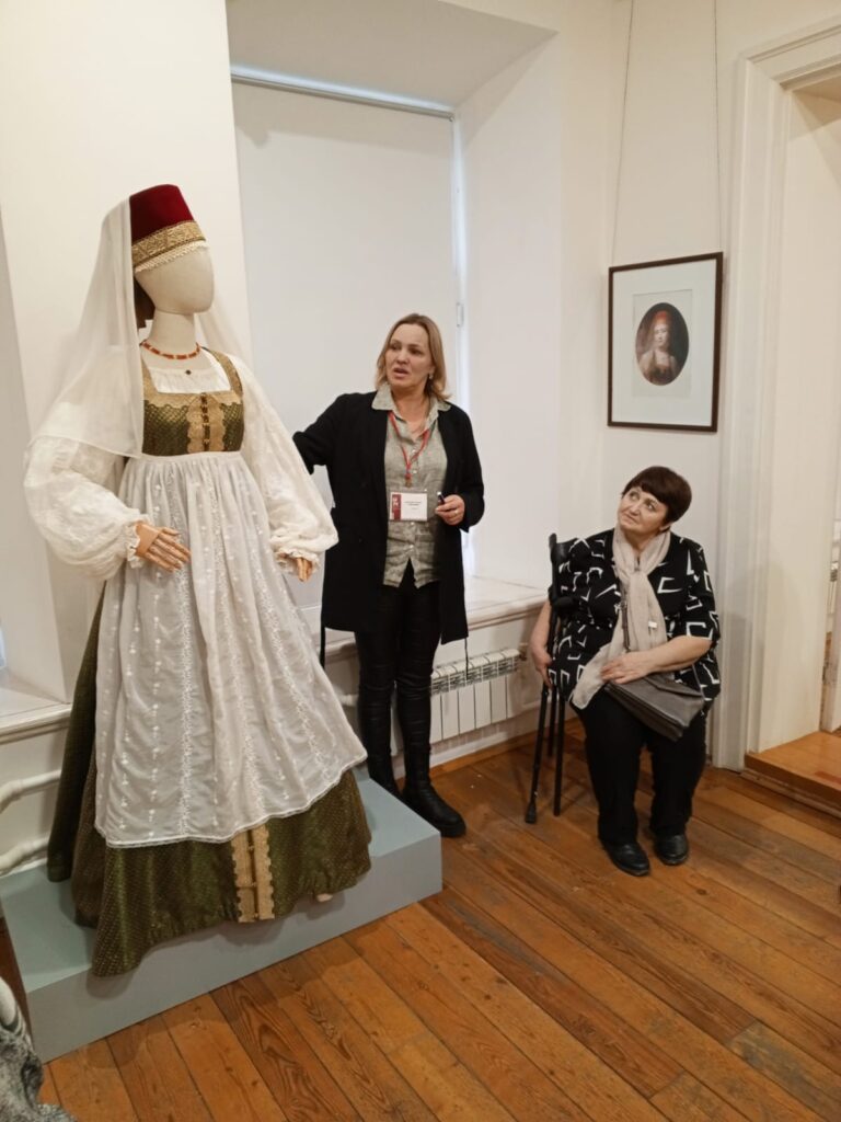 Вместе с экскурсоводом Еленой Викторовной Курицыной участники народного хора людей с ограниченными возможностями по зрению «Родные напевы» (руководитель Денис Сергеевич Миланин) открыли мир красоты и познакомились с 14 новоторжскими костюмами, созданными по акварельным рисункам живописца, историка, архитектора, профессора, художника-этнографа XIX века Ф. Г. Солнцева и изделиями с традиционной золотной вышивкой разных периодов развития новоторжского народного художественного промысла из фондов ВИЭМ.