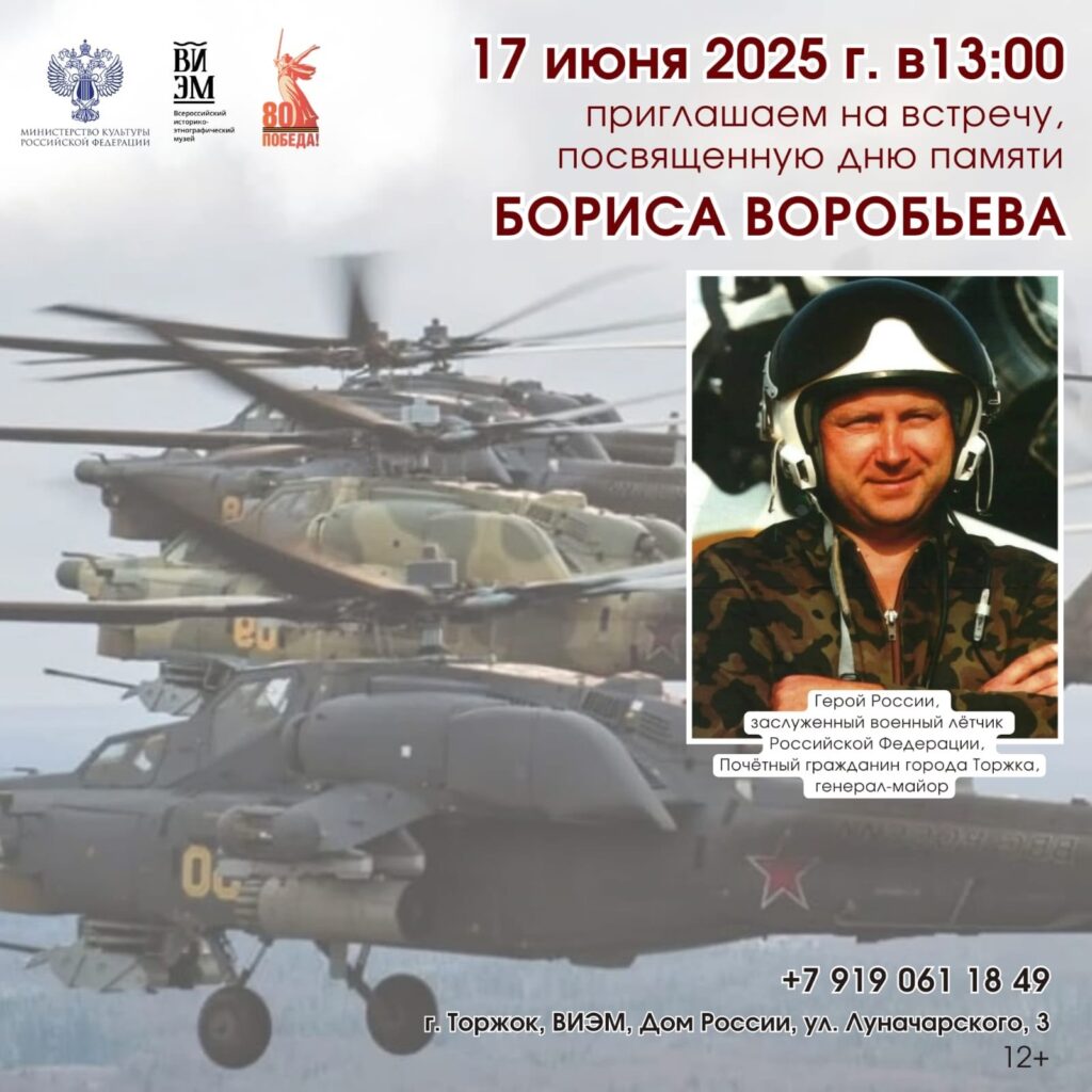17 июня в Доме России пройдут мероприятия, посвященные дню памяти Героя России, Заслуженного военного лётчика Российской Федерации, Почётного гражданина города Торжка, генерал-майора Воробьёва Бориса Алексеевича.