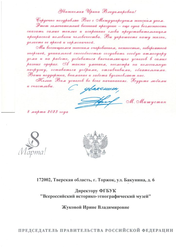 Председатель правительства РФ Михаил Мишустин поздравил директора Всероссийского историко-этнографического музея Ирину Жукову и весь коллектив с Международным женским днём и отметил, что это еще одна возможность сказать самые теплые и искренние слова представительницам прекрасной половины человечества.