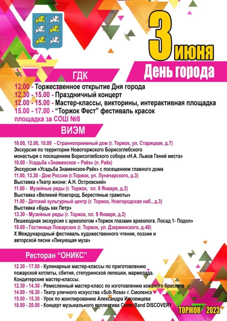 Приглашаем вас присоединиться 3 июня 2023 г. к городским мероприятиям ко Дню города Торжка! Публикуем городскую афишу и ждем вас на площадках ВИЭМ. Мы подготовили интересные события и мероприятия для всей семьи. Добро пожаловать в музей!