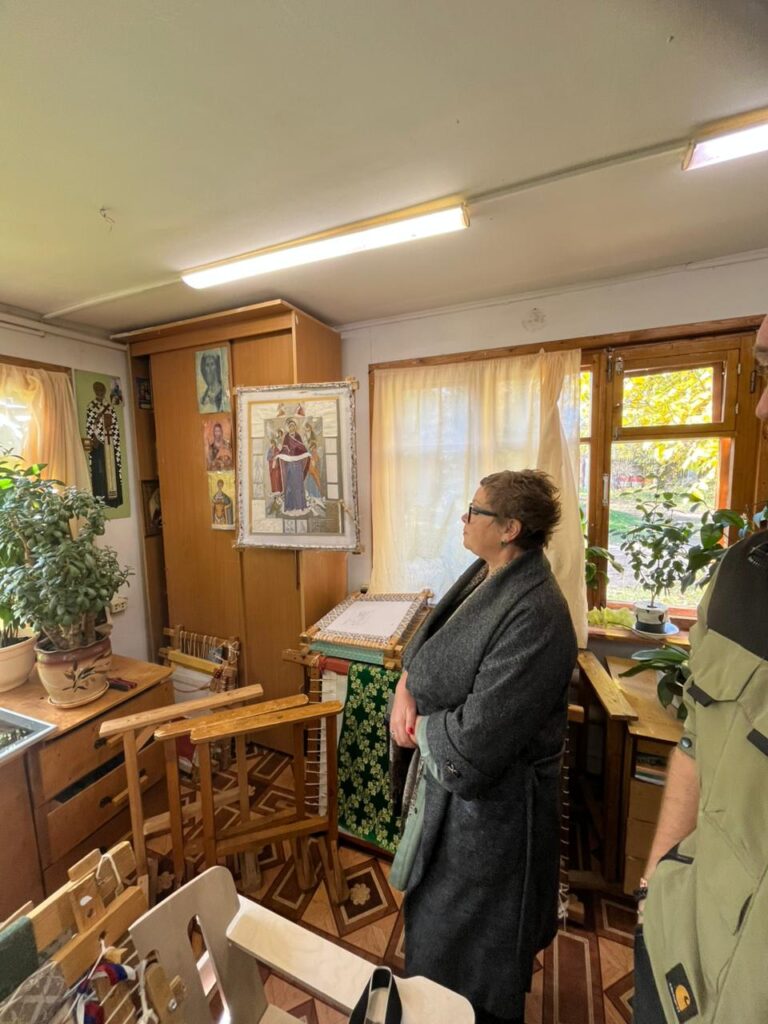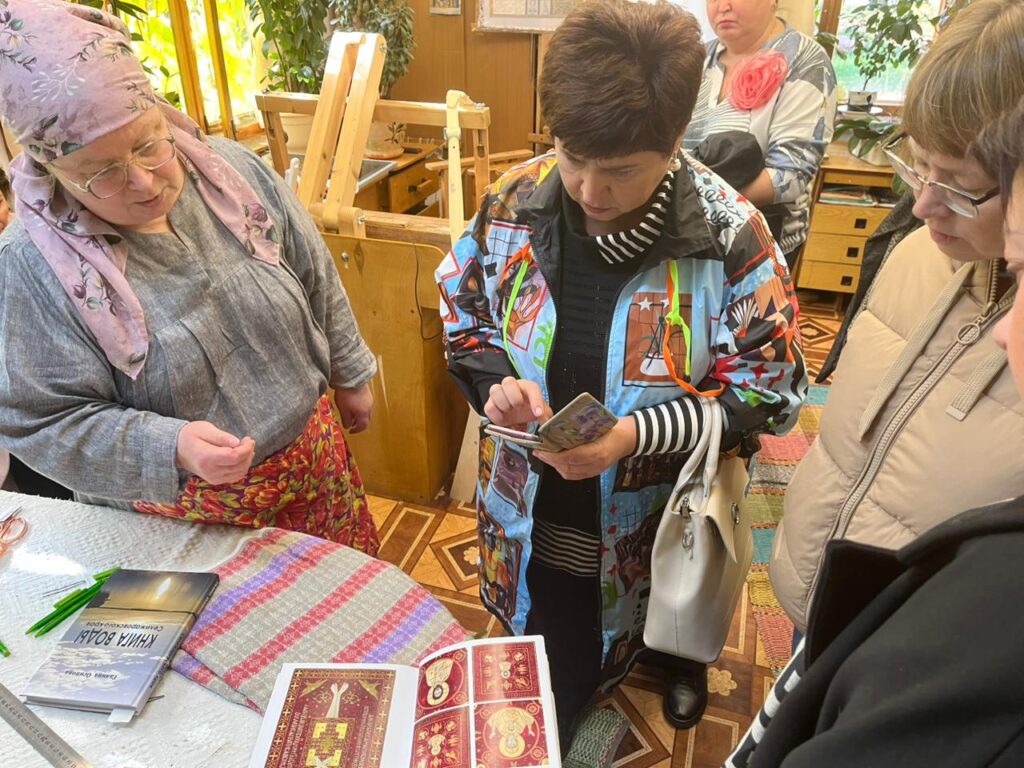 Людмила Васильевна провела для новоторов интереснейшую экскурсию по мастерской, не имеющей аналогов в России. Именно в Селижарове старинные приемы русской вышивки органично соединены с иконописным каноном. Это не просто вышивка, это иконопись по ткани, традиции которой идут из Византии.