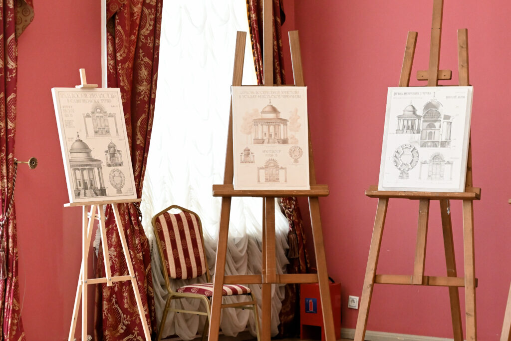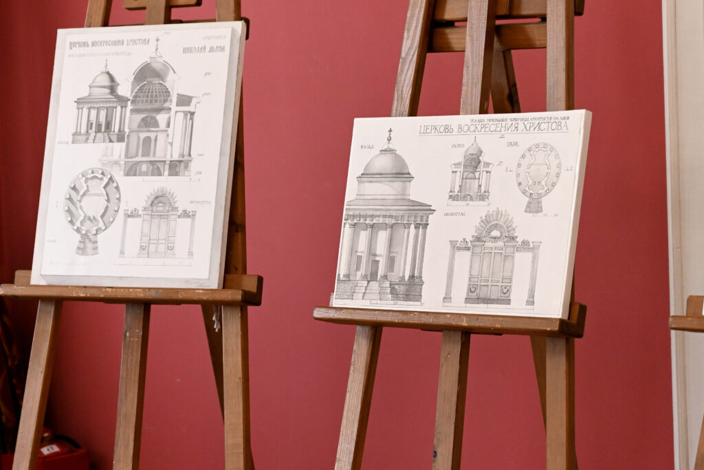 На выставке представлены графические проекты Храма-усыпальницы Воскресения Христова в Никольском-Черенчицах в технике отмывки, выполненные учащимися в рамках дисциплины «Основы по архитектуре». Все работы разные. Особое место в композиции занимает архитектурная деталь в виде иконостаса.
