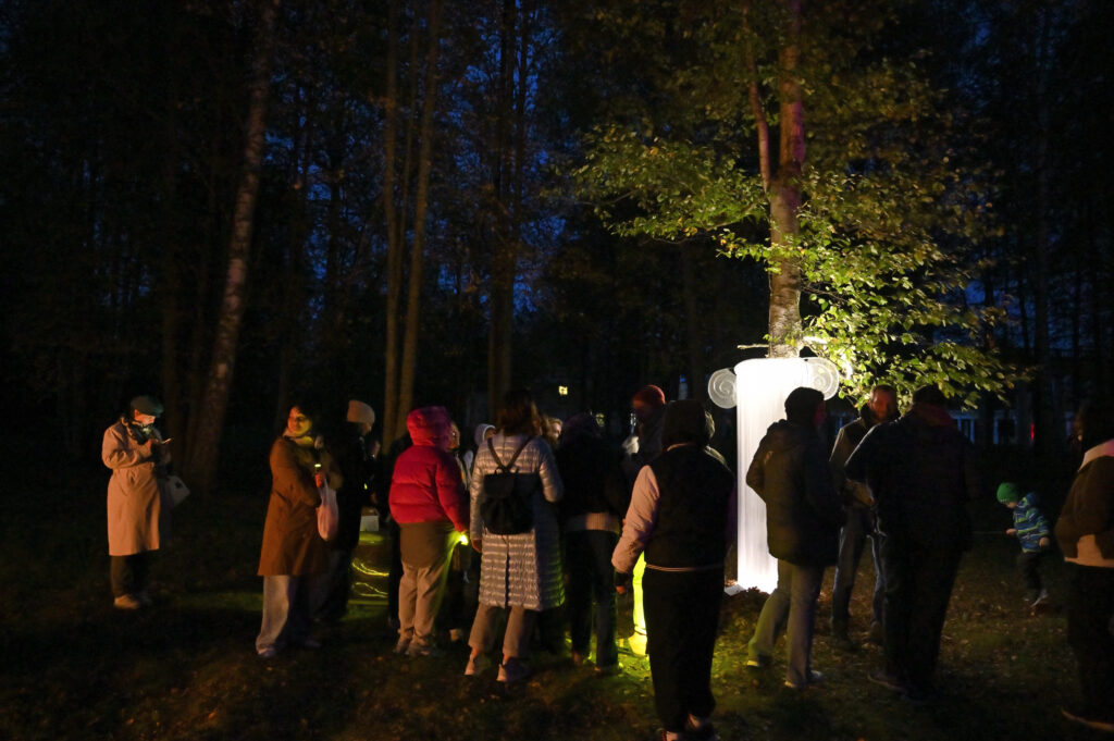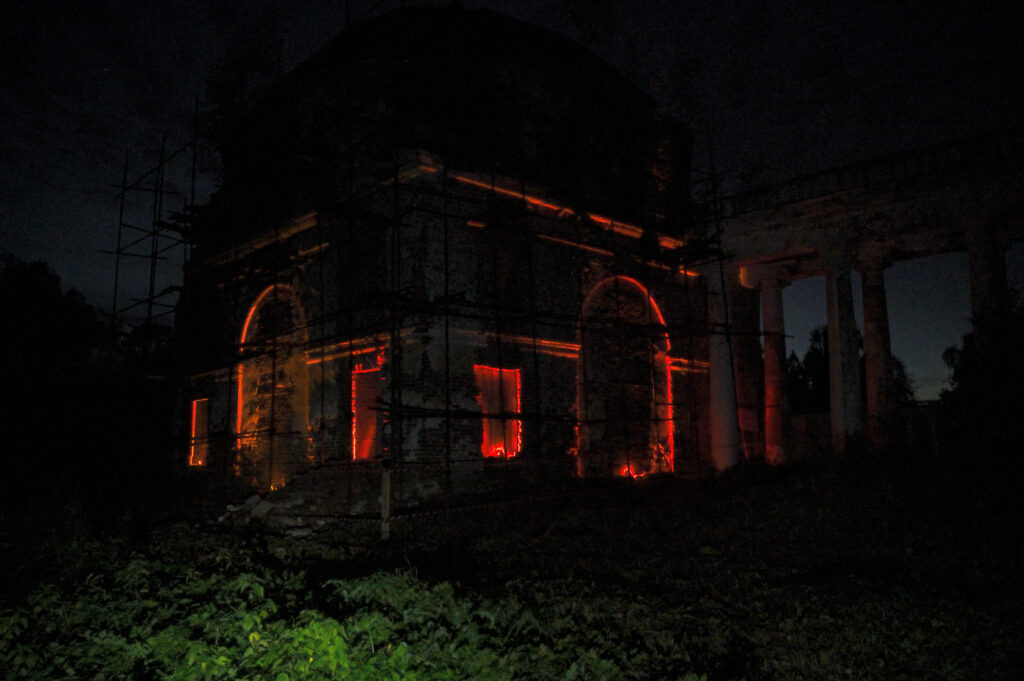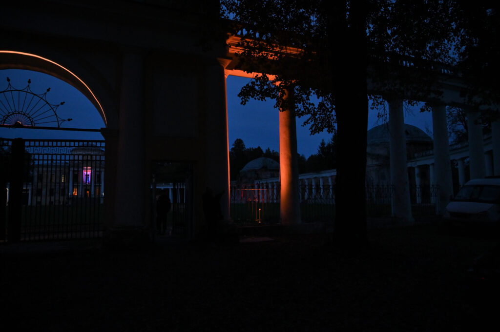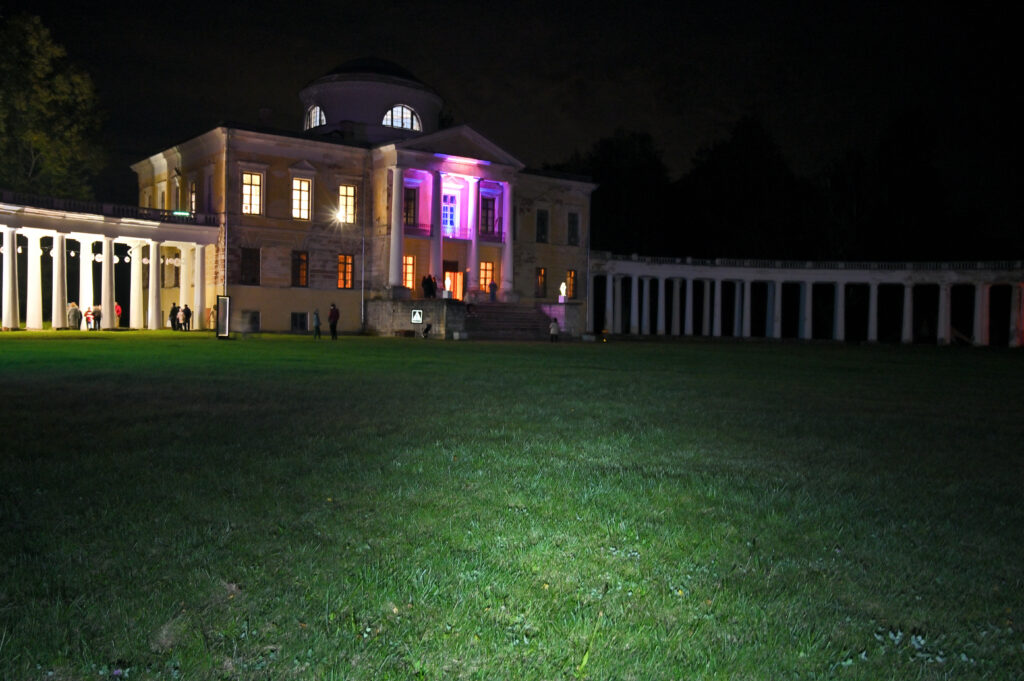 Дождавшись темноты, гости увидели золотые нити маршрутов, домик с «привидениями», колодец памяти, колоннаду деревьев, мерцающую серебряным светом — и колоннаду усадьбы. А в центре – зеркала, тени и многоцветные блики главной драгоценности, усадебного дома.