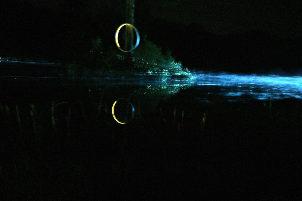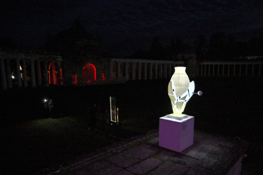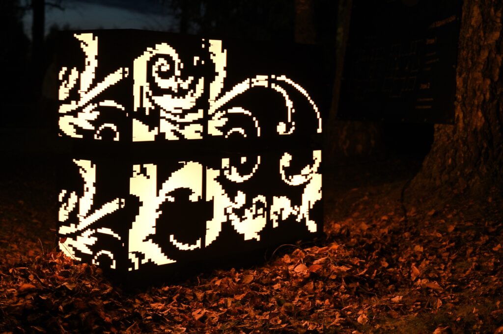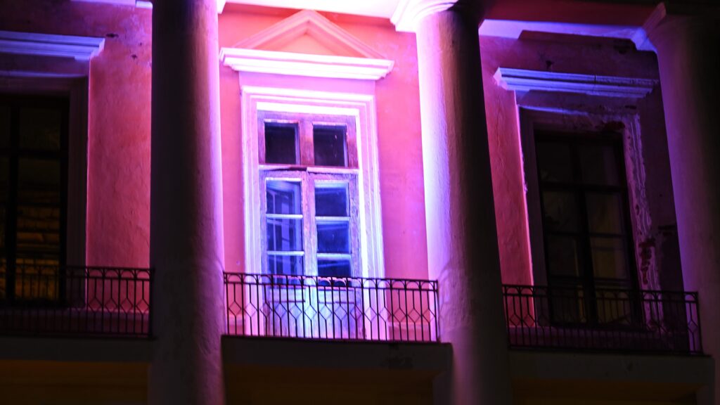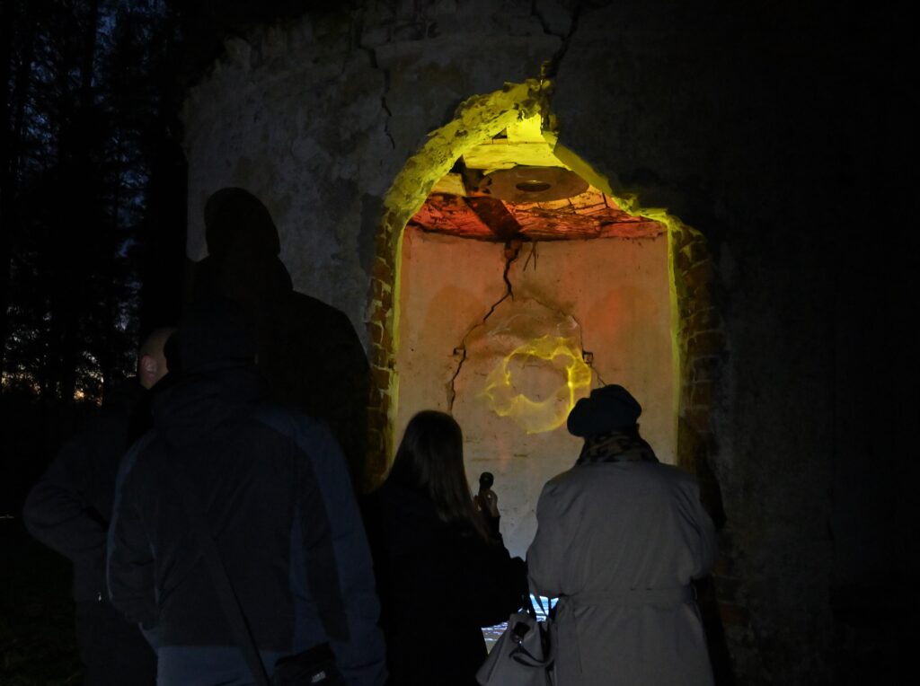 Дождавшись темноты, гости увидели золотые нити маршрутов, домик с «привидениями», колодец памяти, колоннаду деревьев, мерцающую серебряным светом — и колоннаду усадьбы. А в центре – зеркала, тени и многоцветные блики главной драгоценности, усадебного дома.