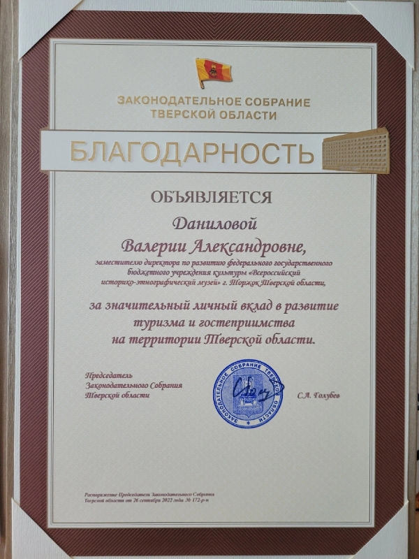 В завершение форума прошло награждение, на котором В. А. Даниловой была объявлена Благодарность от Законодательного собрания Тверской области за значительный личный вклад в развитие туризма и гостеприимства на территории Тверской области.