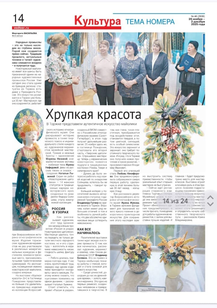 Новоторжская майолика имеет все шансы быть признанной одним из народных художественных промыслов России. Уже сегодня она стала одним из брендов региона: статуэтка из Торжка есть даже у Президента России. Это искусство развивается в Торжке уже более 35 лет. Мастерская, где оно сохраняется, работает при Всероссийском историко-этнографическом музее. Изделия торжокских художников — керамистов не раз участвовали в различных межрегиональных конкурсах и фестивалях, занимали призовые места, признавались лучшими туристическими сувенирами. Но экспозиция, посвященная именно новоторжской майолике, создана впервые. На выставке «Хрупкая красота» (6+) в Гостинице Пожарских представлены более ста удивительно прекрасных изделий из коллекции Всероссийского историко-этнографического музея. Они раскрывают историю промысла, а также творческого поиска и индивидуального стиля каждой из художников — керамистов музейной мастерской. Тонкие и нежные букеты — вдохновение Марины Низовой, анималистические мотивы — любимая тема Ирины Нефедовой, девы из русских песен и сказок — создания Натальи Лыжиной. Серия её работ «Новоторжские щеголихи» — 14 женских статуэток в традиционных нарядах новоторжского края, созданные по акварелям Фёдора Солнцева, стала жемчужиной коллекции.