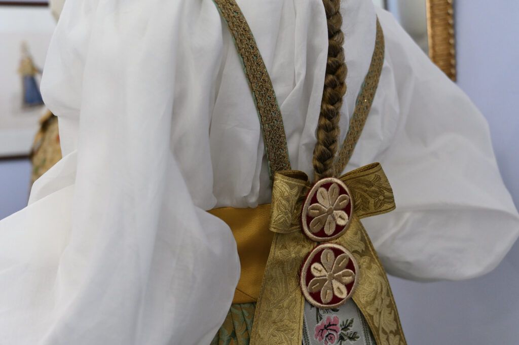 Она делится: в создании этих произведений искусства принимали участие ремесленники и реконструкторы со всей России. Они изготовили аутентичные пуговицы, пряжки, прекрасные подвязи из бисера и жемчуга.