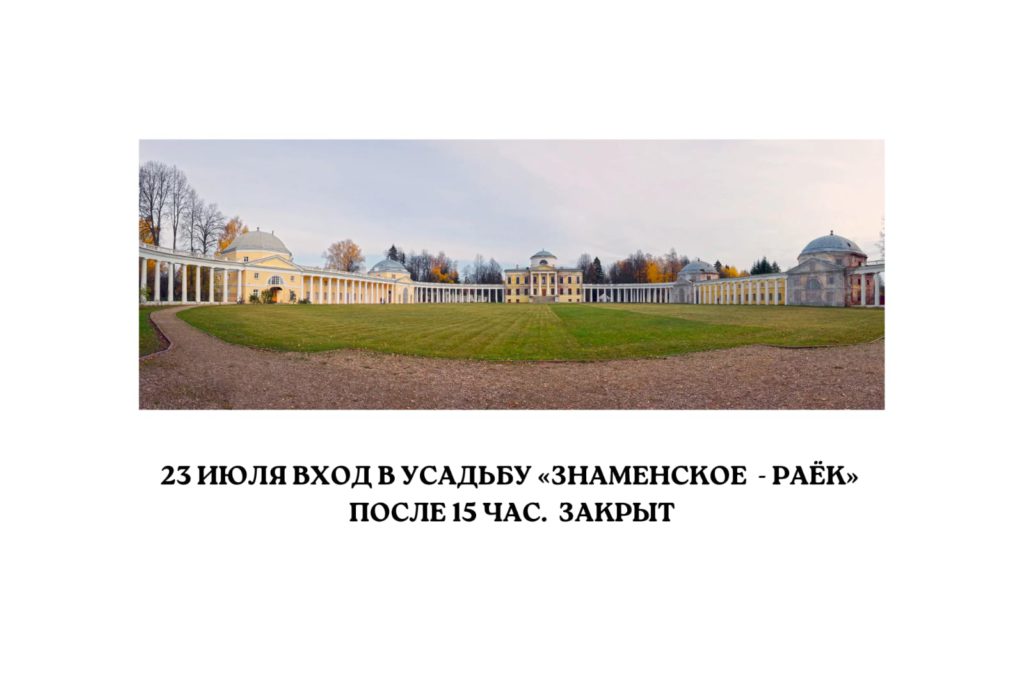 Уважаемые гости! Обращаем ваше внимание на временное изменение графика работы: 23 июля вход в усадьбу «Знаменское-Раек» после 15:00 будет закрыт. Приносим извинения за доставленные неудобства!