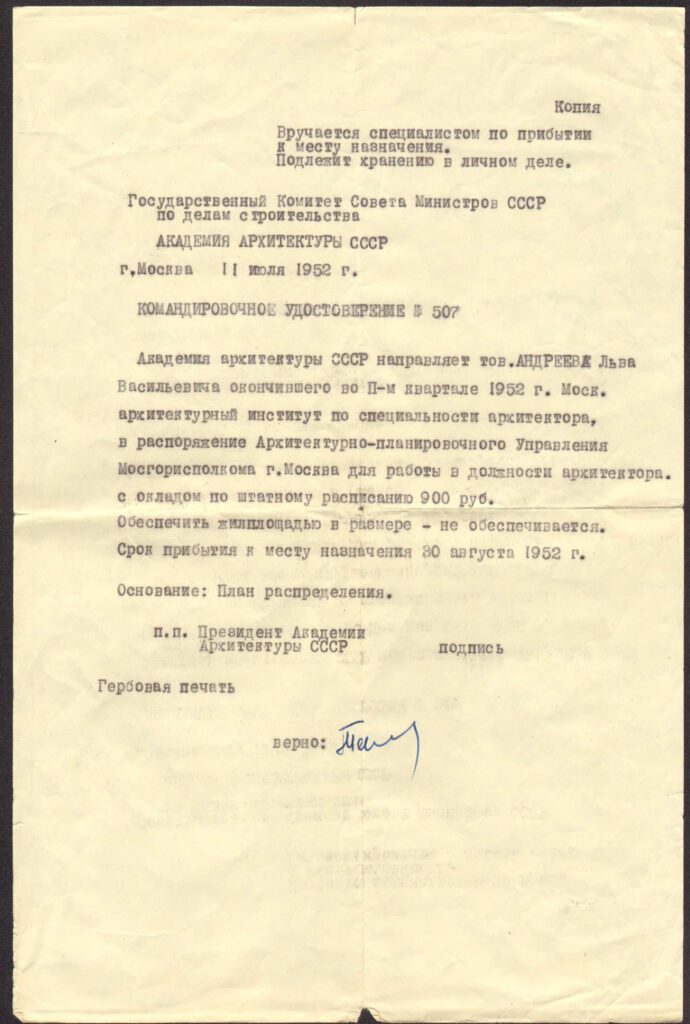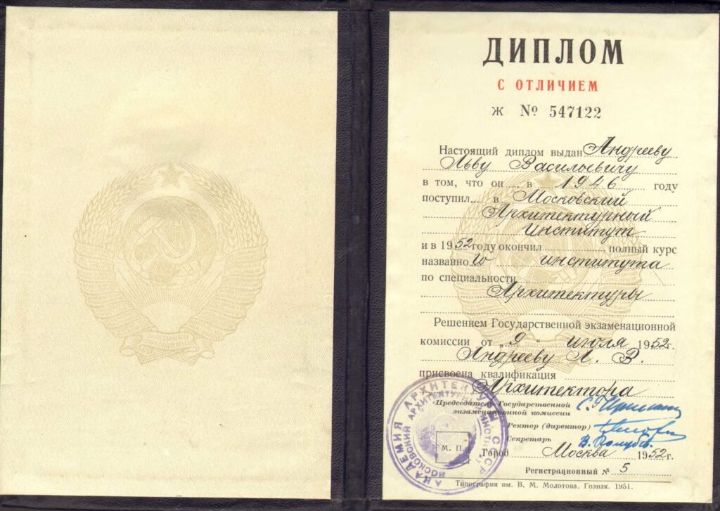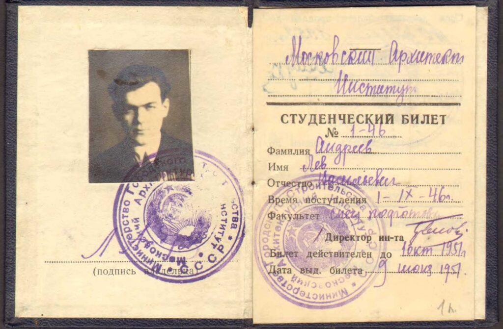 После демобилизации Андреев находился в растерянности без армейского порядка, уже привычных обязанностей и команд сверху. Нужно было определяться, вливаться в мирную жизнь и думать, что же делать дальше. В Московский архитектурный институт Андреев поступил в 1946 году. Это был тот судьбоносный момент, который предопределил всю оставшуюся жизнь. Учась в институте, Лев Васильевич понял, что попал в точку, архитектура – это призвание, а не профессия: «… смысл жизни вижу в созидании, в самом широком понятии этого слова. Человек наполнен жизнью и удовлетворен собой, только созидая, видя плоды своего труда, и материальные, и духовные. Выращивание детей – это тоже созидание будущей жизни. Человек, ничего не созидающий, пустой, бесцельно прожигающий жизнь, скучает, ищет вместо занятий развлечений, не получает удовлетворения от своего существования и неминуемо обрастает пороками и погибает как Человек – высшее создание природы».