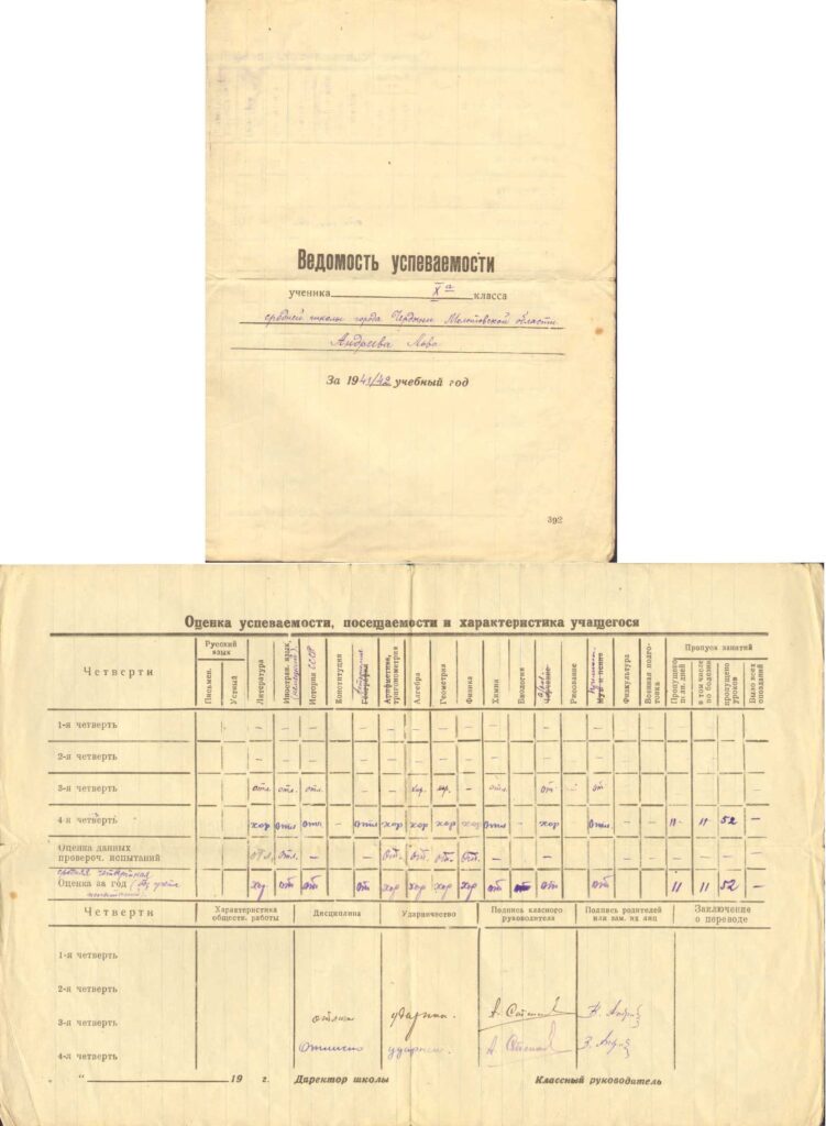 Ведомость успеваемости ученика 10 а класса средней школы города Чердыни Молотовской области Андреева Льва за 1941/42 учебный год. На развороте — таблица успеваемости, посещаемости и характеристика учащегося. г. Чердынь, 1942 г.