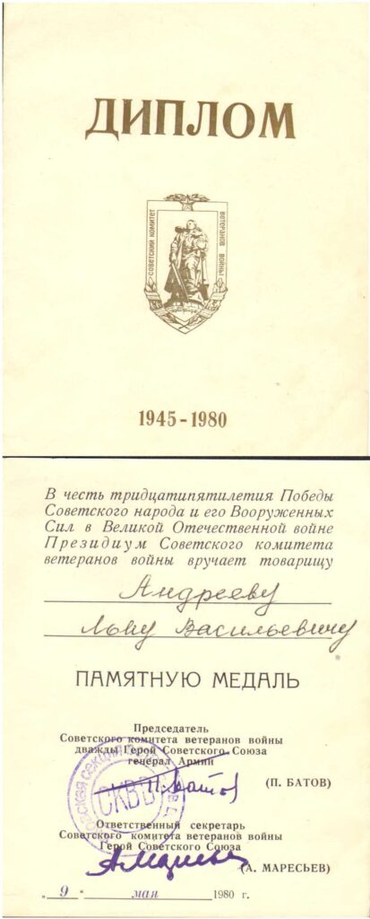 Диплом к памятной медали в честь 35-летия Победы Советского народа и его Вооружённых сил в Великой Отечественной войне Андреева Льва Васильевича, выдан 9 мая 1980 г.