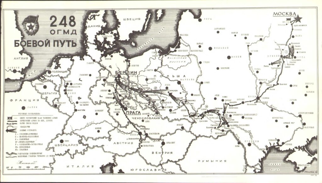 В 1978 г. Л. В. Андреев изобразил схему пути движения 248 ОГМД для ветеранов своей воинской части. По ней можно проследить боевой путь самого автора: «… могу заверить, что и мысли о… геройстве не было ни у кого из нас. Был бой, была спешка, и было большое чувство ответственности за свое дело – успеть! Мы успели, а судьба фронтовая была к нам милостива – оставила на сей раз нас в живых. А могло быть и иначе».