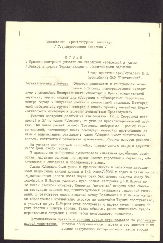Отзыв Л.В. Андреева о проекте застройки участка по Тверецкой набережной и улице К. Маркса в городе Торжке жилыми и общественными зданиями. Автор проекта: арх. Городович В.П. Застройщик: ОАО «Пожтехника». Рецензент: профессор Андреев Л.В. автор Проекта охранных зон и Проекта реконструкции исторического ядра города Торжка. 4 л. 5 апреля 2000 г.