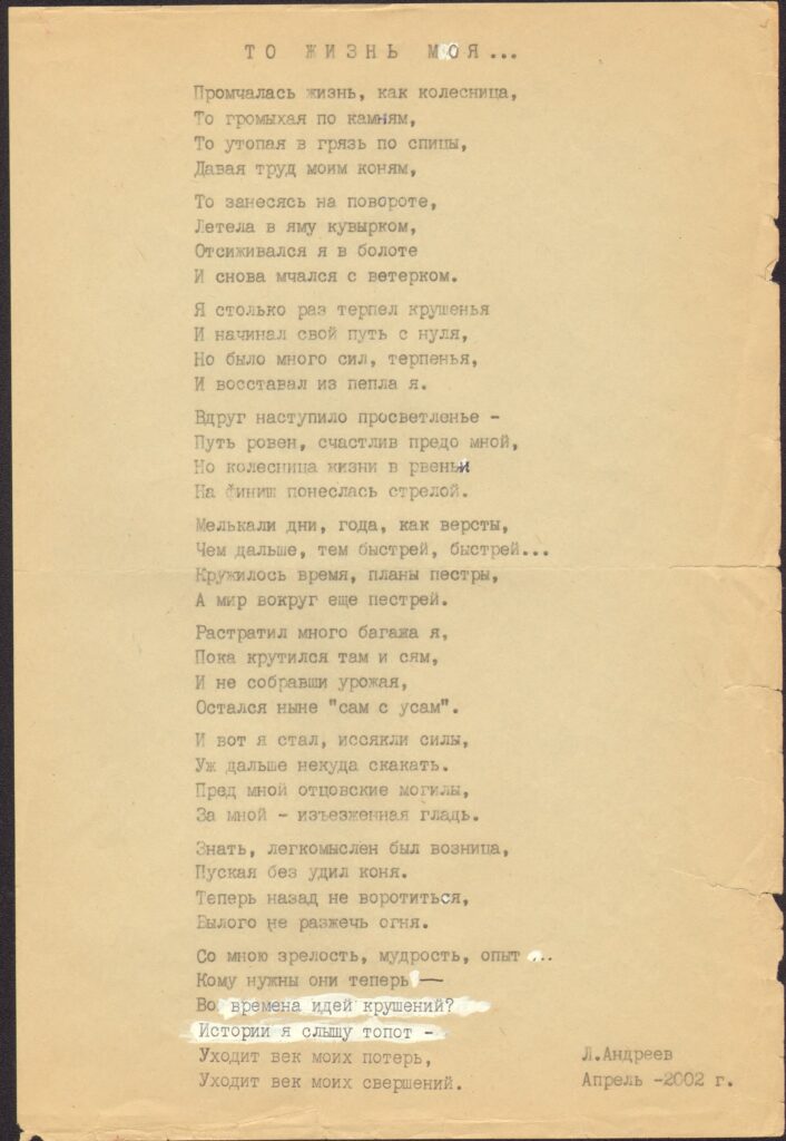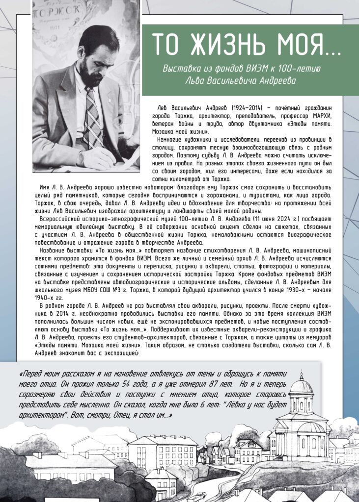 Название выставки «То жизнь моя…» повторяет название стихотворения Л. В. Андреева, машинописный текст которого хранится в фондах ВИЭМ. Всего же личный и семейный архив Л. В. Андреева исчисляются сотнями предметов: это документы и переписка, рисунки и акварели, статьи, фотографии и материалы, связанные с изучением и сохранением исторической застройки Торжка.