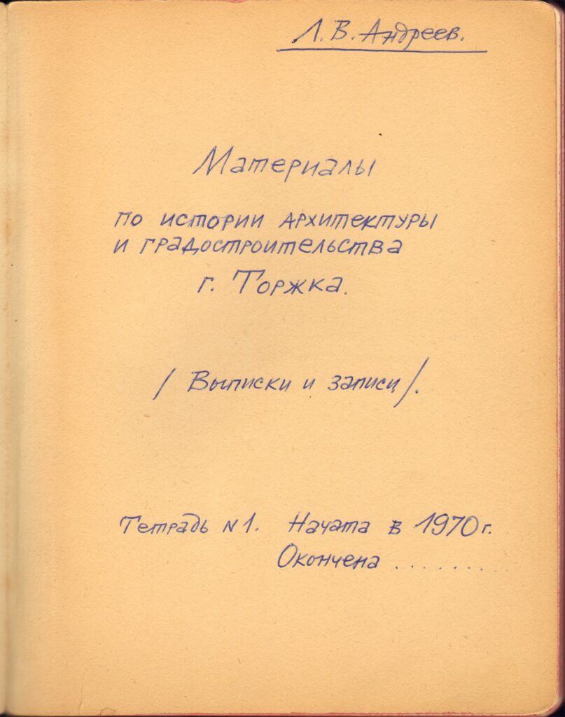 В своей книге Андреев довольно подробно описывает Торжок конца 20-х годов ХХ века: «У меня такая родина – Торжок, древний русский небольшой городок, красивый, уютный, соразмерный Человеку. Я благодарен судьбе за такую родину и не согласился бы променять ее на иные, пускай райские места. Здесь жил и трудился мой прадед, здесь родились и прожили всю свою жизнь мой отец и дед. Здесь родился и я. Но Торжок не только дал мне жизнь. Здесь я был обласкан судьбой, здесь с детства меня окружали замечательно умные, интересные, милые люди. Здесь я впервые ощутил красоту мира, красоту жизни, красоту человека. Здесь я глубоко вдохнул чувство родины – великое чувство любви и добра. Здесь слагалась основа моей натуры, здесь был создан «я»». Многое из того, что он помнил о том, «старом» Торжке, Лев Васильевич отразил в своих акварелях.