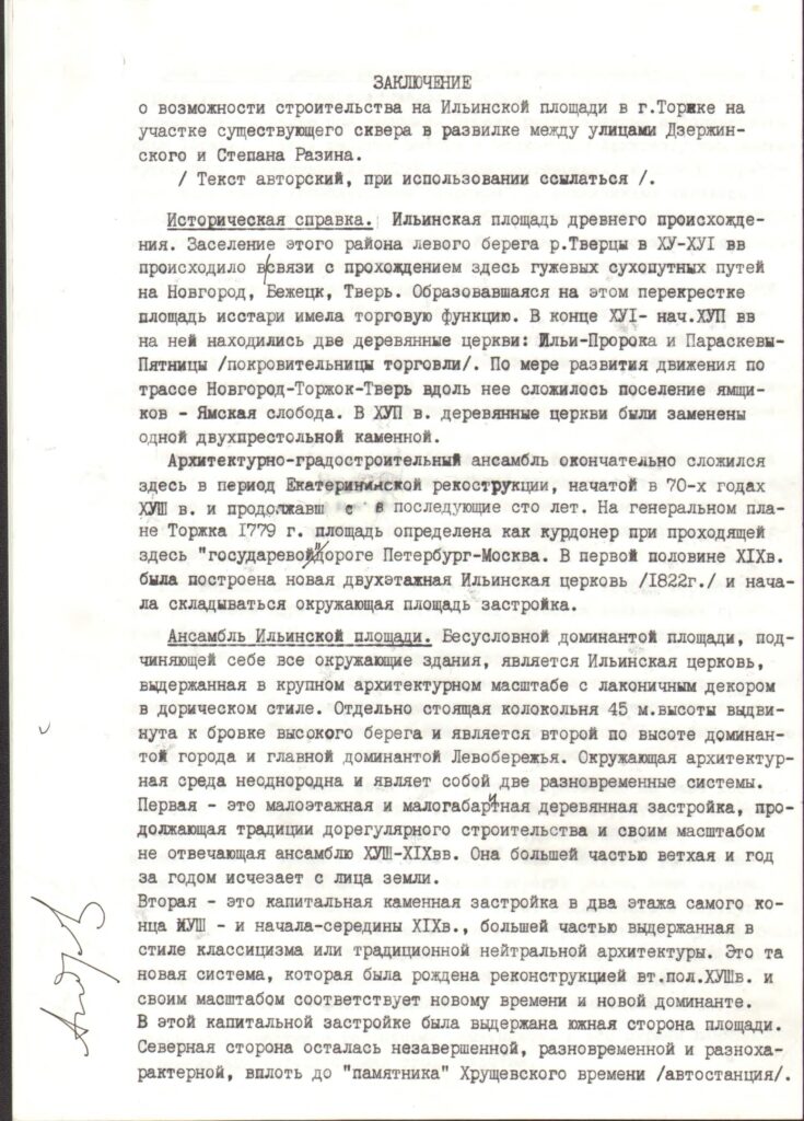 Статья. Л.В. Андреев. Заключение о возможности строительства на Ильинской площади в г. Торжке на участке существующего сквера в развилке между улицами Дзержинского и Степана Разина. Торжок, 08 октября 2005 г.