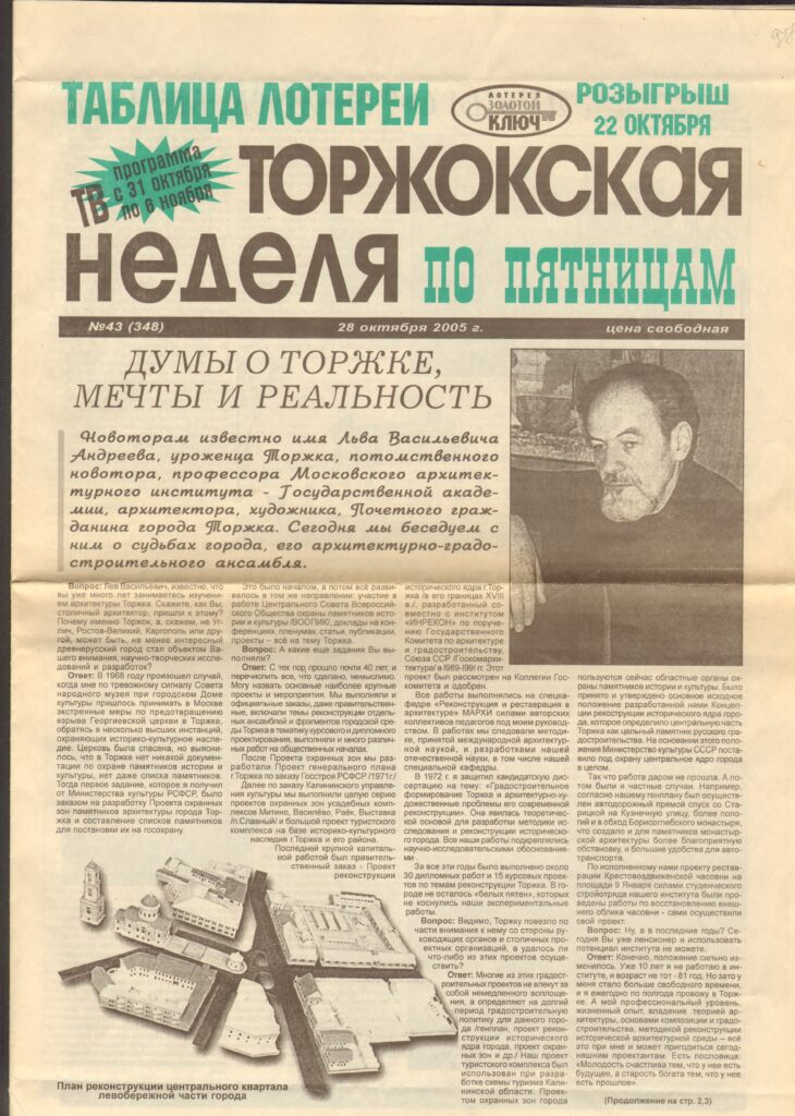Статья Л.В. Андреева «Думы о Торжке, мечты и реальность» в газете «Торжокская неделя по пятницам» № 43 (348) от 28 октября 2005 г.