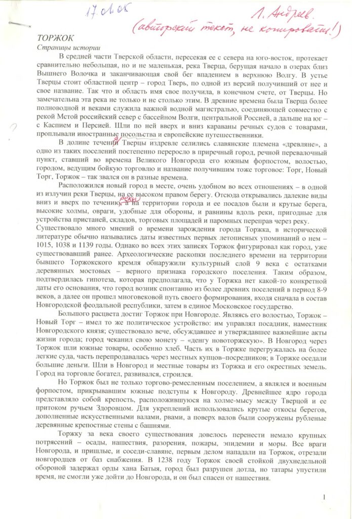 Рукопись машинописная статьи Л.В. Андреева «Торжок»: [Черновой (рабочий) вариант текста к книге «Торжок. Город красоты и добра: История и современность». Тверь, 2005].