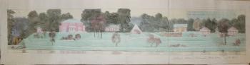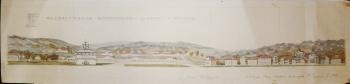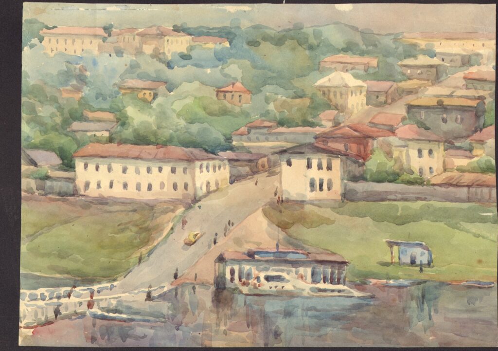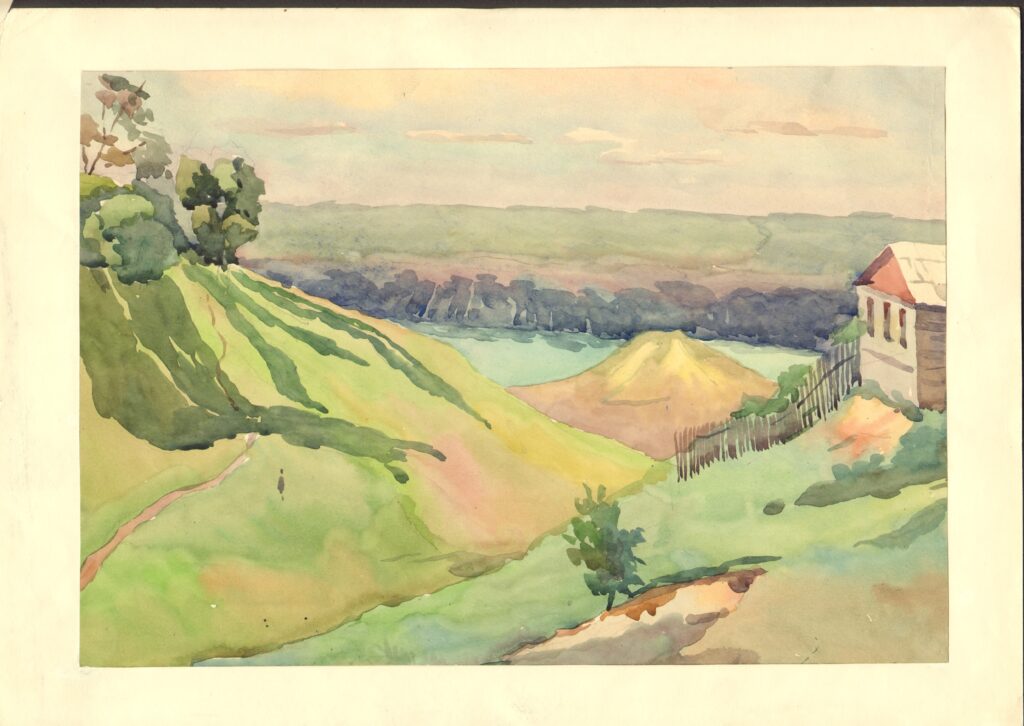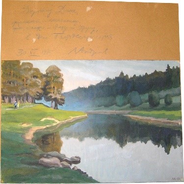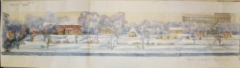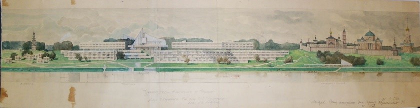 Эскиз панорамы дипломного проекта «Туркомплекс – пансионат в Торжке» студентки МАРХИ Коренновой Н. Внизу подпись карандашом: «Туркомплекс – пансионат в Торжке. Дипл. Н. Кореннова. Рук. Проф. Б.Р. Рубаненко. Доц. Л.В. Андреев».