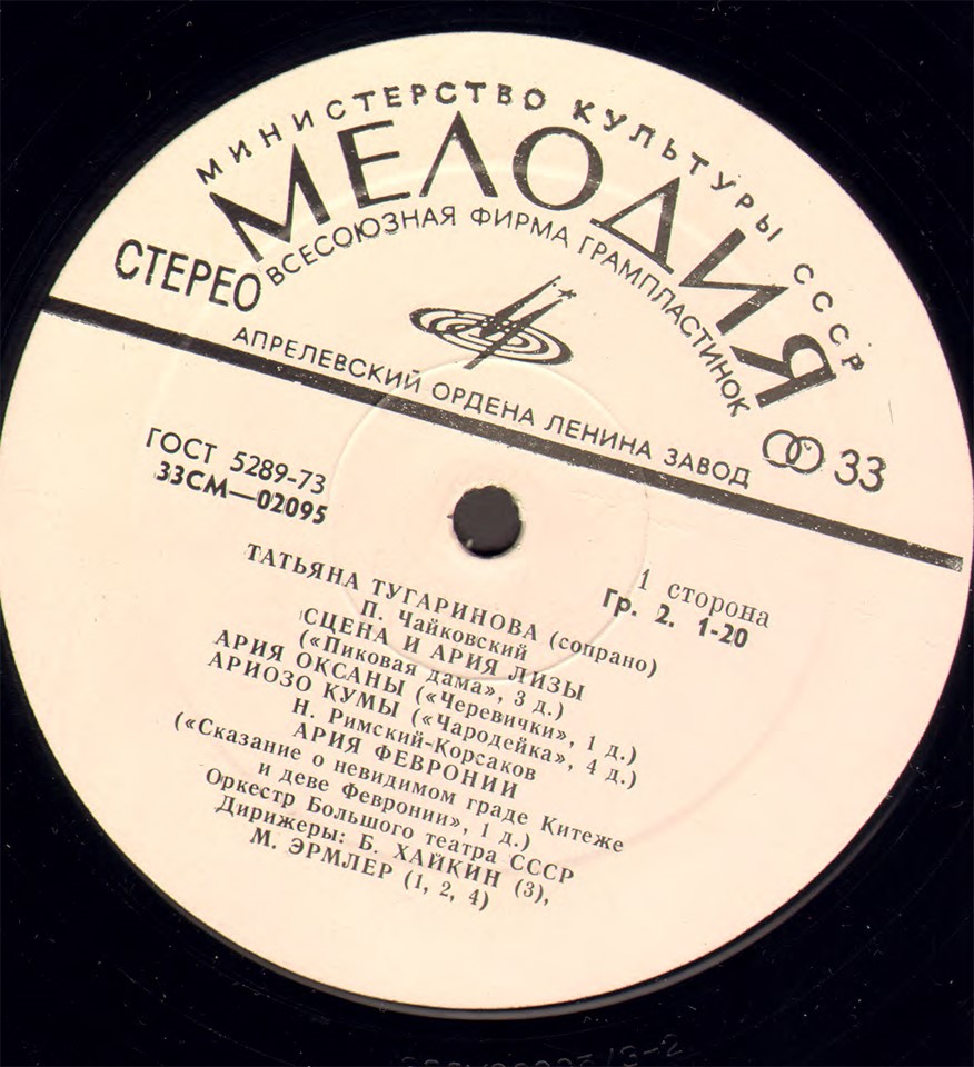 Грампластинка. Татьяна Тугаринова. Арии из опер. Апрелевский завод, 1970-е гг.