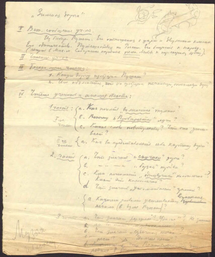 Рукопись В.Н. Андреева к уроку литературы. Анализ стихотворения А.С. Пушкина «Зимняя дорога». Торжок, 1930-е-40-е гг.