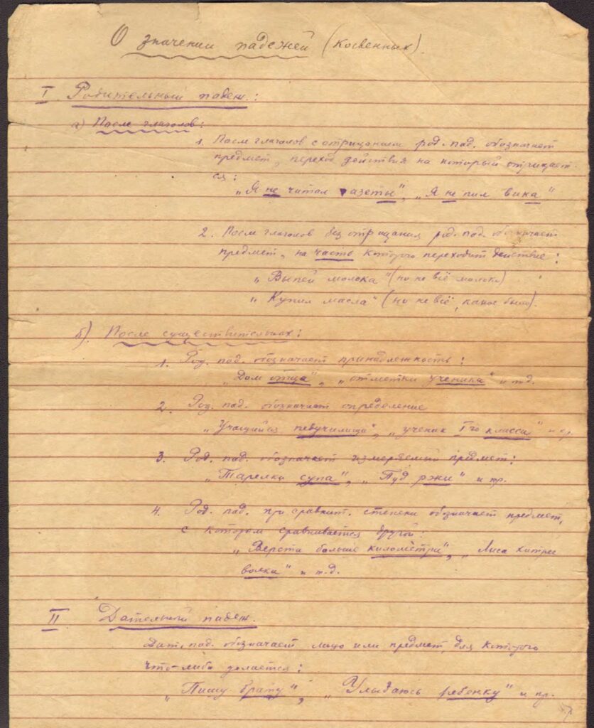 Рукопись В.Н. Андреева к уроку русского языка «О значении падежей (косвенных)». Торжок, 1930-е-40-е гг.