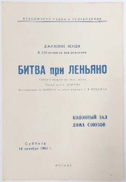 Программа Всесоюзного радио и телевидения оперы Верди «Битвы при Леньяно» 12 октября 1963 с участием Т. Ф. Тугариновой